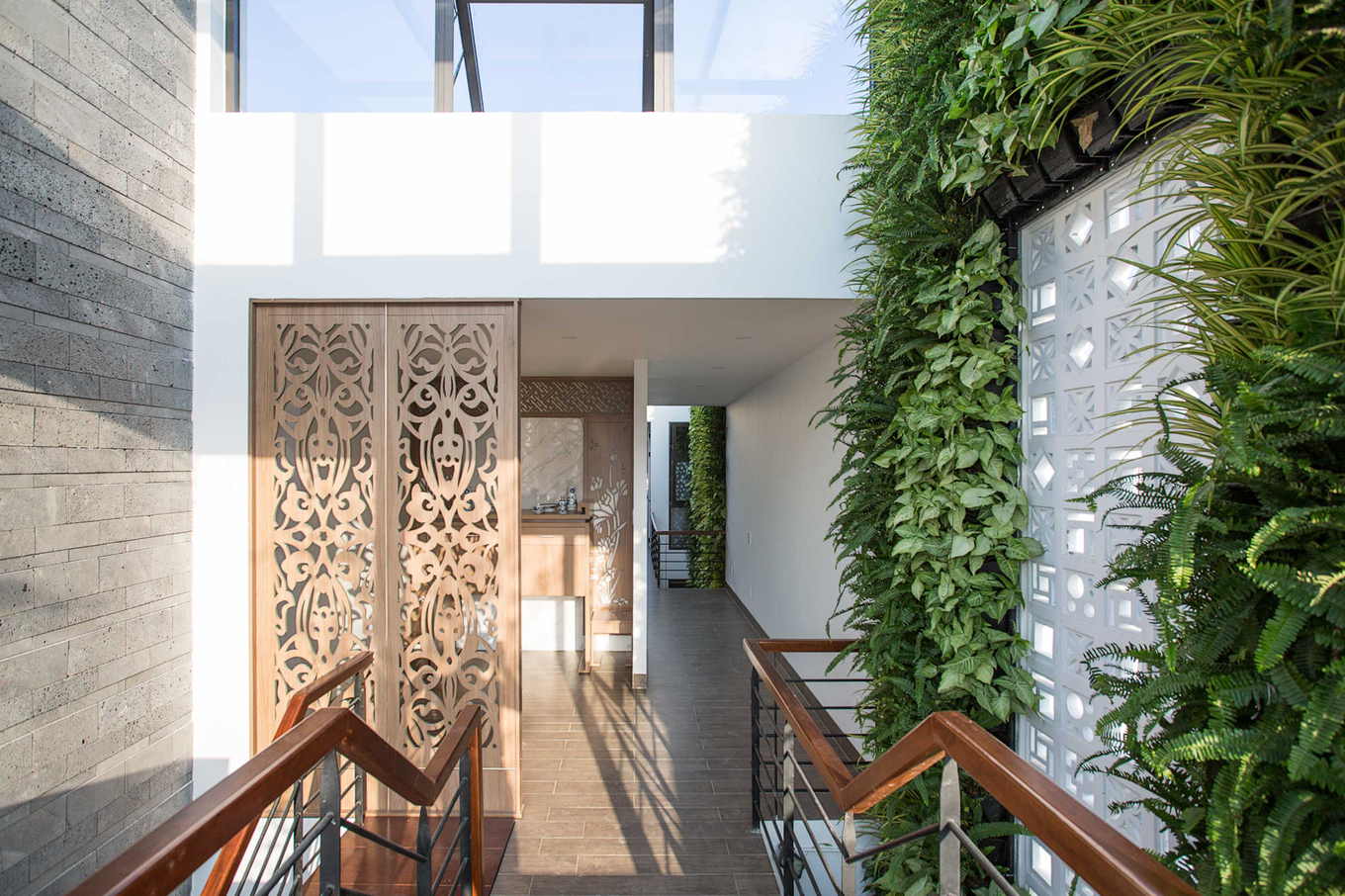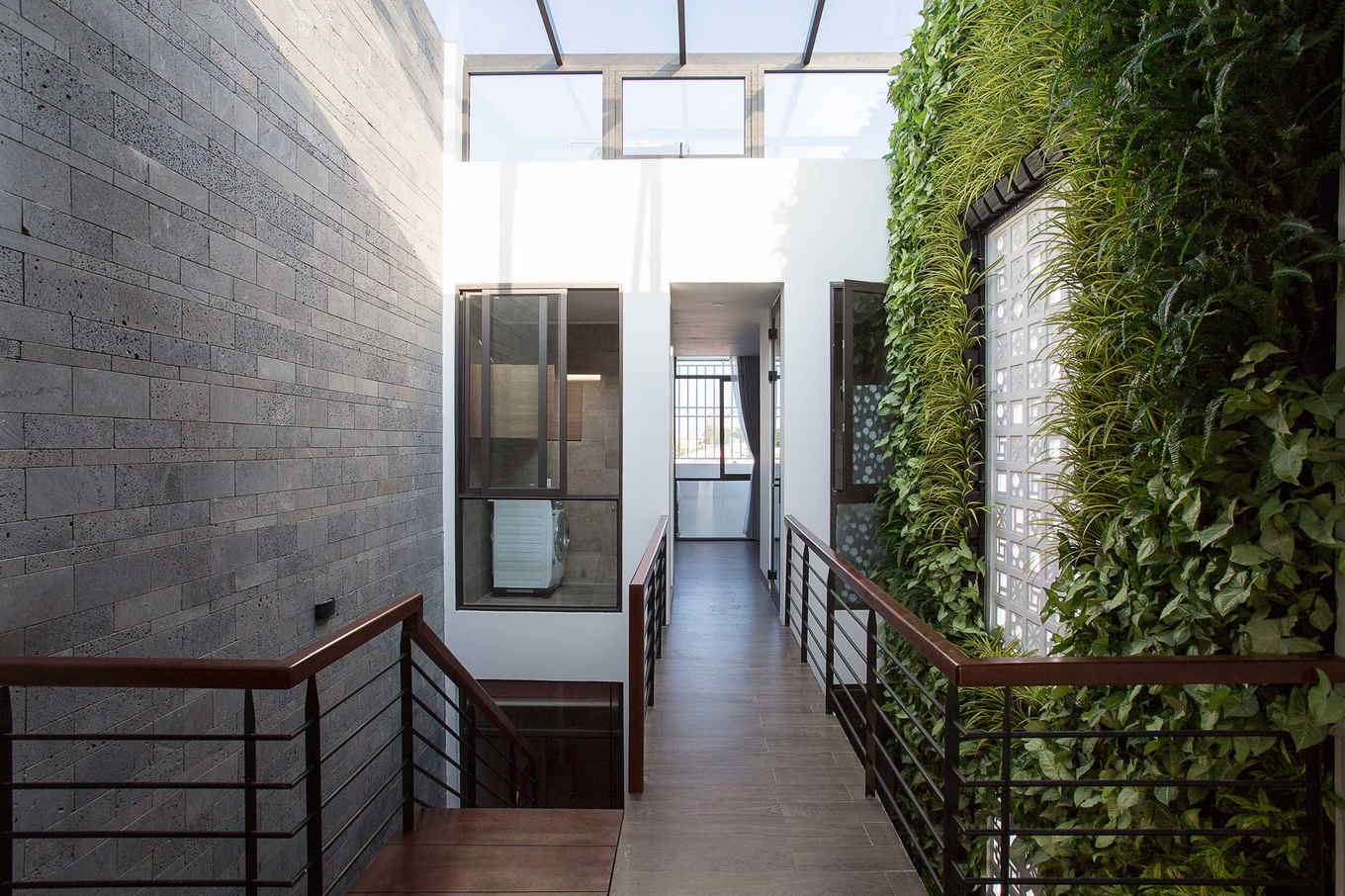 - Khu vực đặt cầu thang đồng thời cũng là giếng trời. Những bức tường bên cạnh cầu thang được biến thành khu vườn thẳng đứng, thông suốt từ tầng một lên mái.