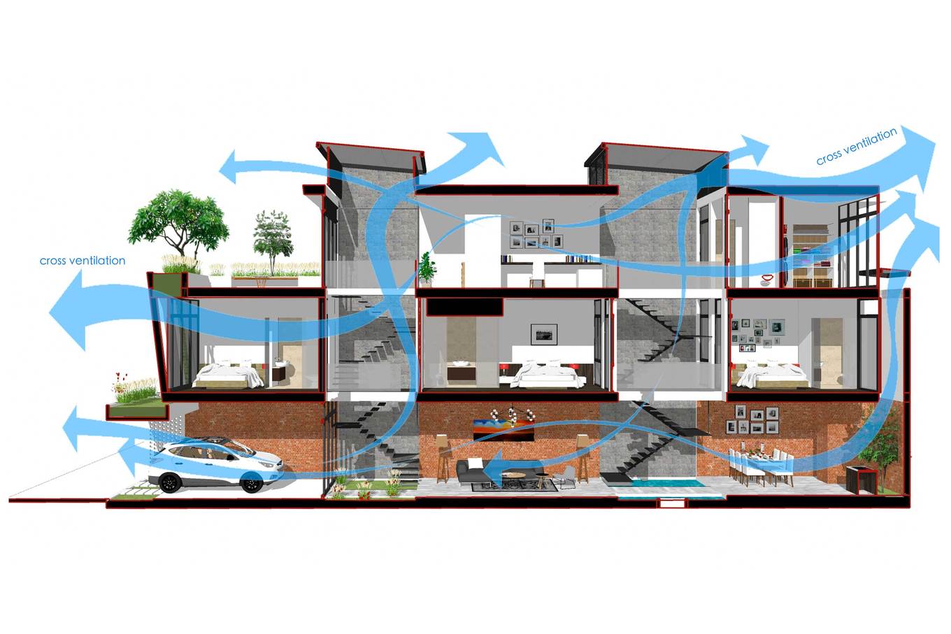- Garage để xe ôtô được đặt ngay phía ngoài cùng tầng một và được ngăn cách với các không gian khác bởi hệ thống cửa trượt.
