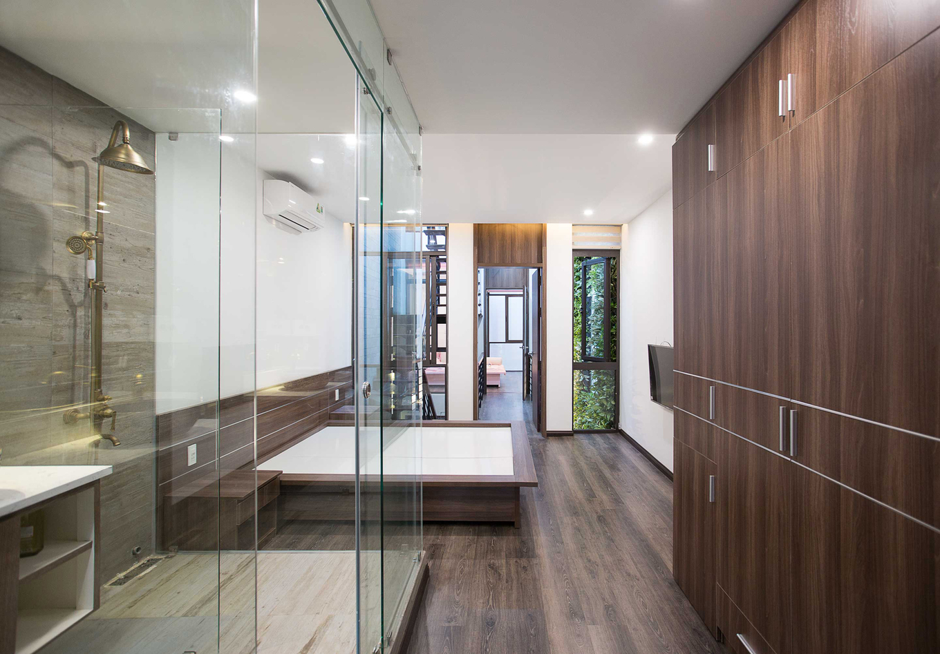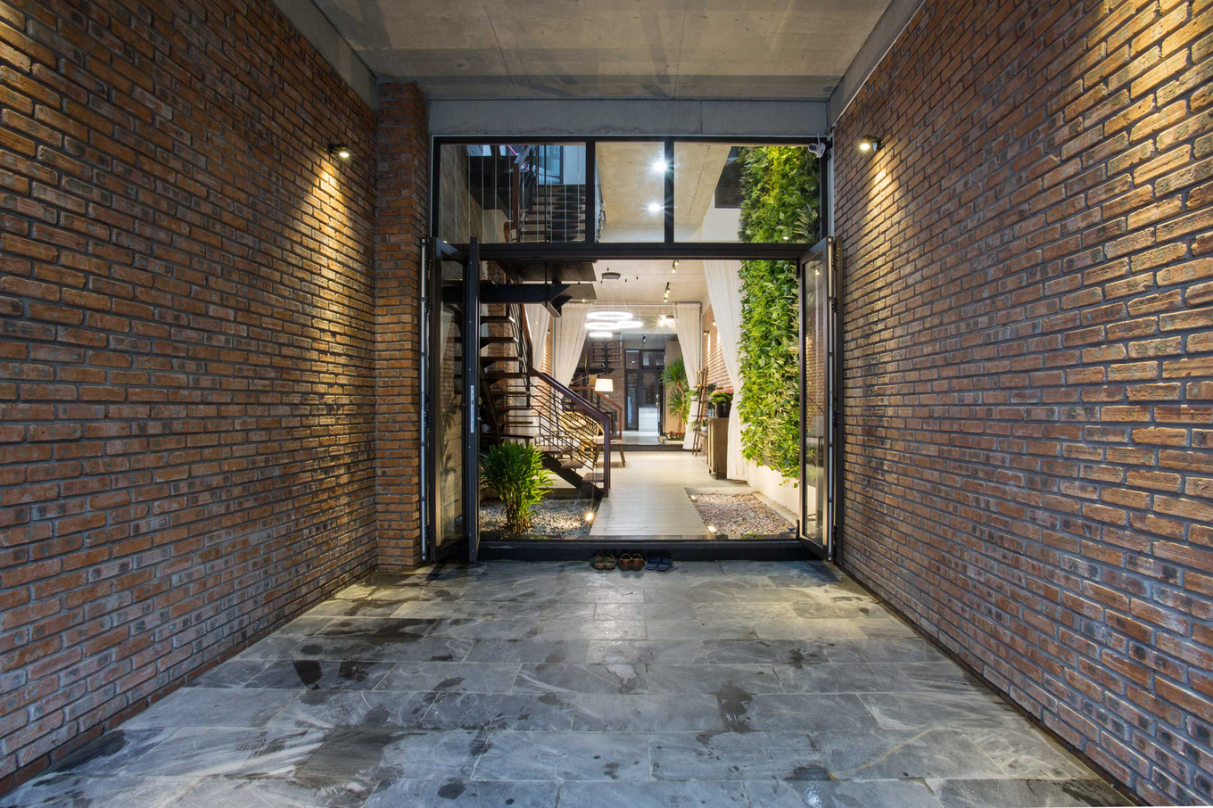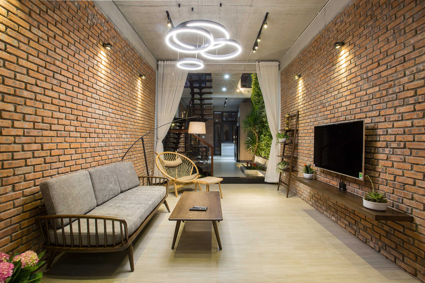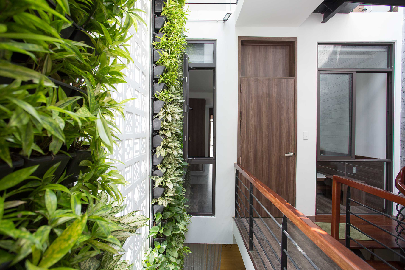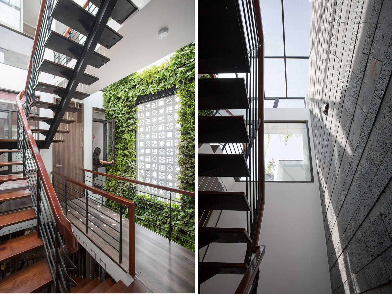- Khu vực đặt cầu thang đồng thời cũng là giếng trời. Những bức tường bên cạnh cầu thang được biến thành khu vườn thẳng đứng, thông suốt từ tầng một lên mái.